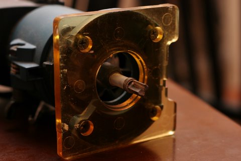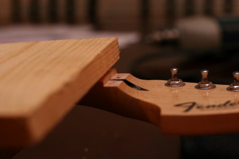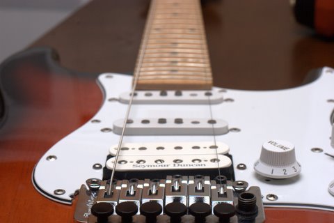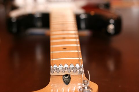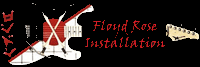 Installing a Floyd Roseby George Mangos I have spent a lot of time installing many dozens of Floyd Rose bridges from OLPs, to Fender to even Squire guitars. Lot's of people ask how to install a Floyd Rose... Alrighty, many people are curious what is involved in the installation of a Floyd Rose. I am going to be brief and to the point. Your installation may not be exact to this, but it should be pretty damn close. The most important thing to remember is that sometimes wood can be replaced, other times it can not. You can plug a hole and re-drill it for the pivot screws, but you can't just add wood if you rout the fingerboard sloppy for the nut. Before getting started, remove the strings as well as the pickups or pick guard to keep them out of the way. If you have a drill press, you can keep the pups in place. I don't. I use a portable drill press since I only need it for two holes. Nut Installation Remove the old nut by gently tapping the small edge of a tiny eye glass repair screw driver under the nut to pry it loose. Careful not to dig into the wood. Once the nut is removed, clamp two pieces of wood on the fret board to form a table top. I use a flat approximate 6x3 piece on top about 3/4 inch thick, and I use a piece of crown molding on the bottom what has a curve to better fit the back of the neck. Line up the edge of the top board with the edge of the neck slot. This is your nut jig. BE CAREFUL NOT TO LET YOUR ROUTER TIP OFF THE LEDGE, OR YOU COULD LOSE A SERIOUS CHUNK OF THE FRET BOARD!!! Use a small router with a bit that has a ball bearing on it to keep it flush against the board, and hence a straight line for the nut. You can buy them at Stew Mac or maybe your local hardware store. Pass the router several times taking off about 1/8 at a time. Frequently line up your nut and check the height. If you go to low, which does happen sometimes, you can shim the nut with a piece of sandpaper underneath it. Line up the nut, and drill the holes to mount it. If you have a drill press, install the nut with the countersink hole in the back of the neck, and bolt the nut from the back. I don't have a drill press, so I buy nuts that have a countersink in them and screw them from the top. Either way is fine, and I have not had any problems with the screw-downs from the top. If you screw up a hole, fill it with wood glue and a toothpick and pay attention next time. You see guitars that have a little chrome bar behind the nut. This is a string retainer and is used to keep the strings below the nut. This way the strings are flat against the nut and won't go sharp when you tighten the locking nut. If you have a slanted headstock, you shouldn't need the retaining bar. Bridge Installation The bridge should drop into just about any trem hole already there with little need for modification. If you are attempting to install a Floyd on an LP or something else that doesn't have the hole, you have a lot of work ahead of you, and you have my sympathy. If you are interested in your Floyd "floating", follow the instructions below, but before you setup the Floyd, trace it completely on your guitar and route a rectangle for the main bridge piece, and another for the block screws section. Stew Mac sells templates for this. Line the bridge edge up with the existing screw holes from the previous bridge if available. This is your pivot edge. Otherwise you need to measure the exact distance from the nut to the 12th fret, then double it to where the saddle and string will meet. Take a string and pull it taught against the outside slot on the nut, and the outside saddle. Do both sides to align the bridge evenly. You don't want to have your 6th hanging off at the 15th fret, do ya? Once the bridge is aligned, you need to figure where the holes for the pivot screws are going to go. (Here is an interesting tidbit: Notice how the strings are not directly above the pole pieces on the humbucker. This is standard size Seymour Duncan pickup, but they also make the same model pickups slightly more spaced on the pole pieces, called Trembuckers, to line up the strings and look pretty on guitars with Floyd Rose bridges (and I suspect other bridges as well) :) I have used both spaced pickups for many years with no noticeable difference in tone, but that is just me!) Now here you really need to focus and pay attention. Trace the outline of your bridge on the guitar with a pencil, then carefully measure the bushings and drawing to find where you will put your pilot holes for the pivot screws. You've heard measure twice, cut once? Don't do it half assed the first time. If you do screw up the holes. Fill them with wooden dowel available at the hardware store and redrill. Once you find the right spots, drill! Start off with a small bit, and gradually move up. I used 6 bits from start to finish before my hole was big enough for the bushing. If you have access to a drill press, use it! As mentioned, I don't have a need, so I bought me a small portable one from Home Depot for around $15. You connect your drill and it provides a nice stand. As you can see it works just fine. Once your holes are drilled, work up a glob of spit and spit in each new hole. This is to provide a lube to help the bushings go in easier. Gently tap the bushings into place using a piece of wood on top of the bushing so you don't damage it with your gorilla hands and the hammer. If you are felling too much resistance, stop, and make sure the hole is big enough. If not careful, you could put a nasty split in the wood. Then you really are screwed. Screw in the pivot screws, lay down the Floyd, and check your alignment with a string the same as you did before. If you screwed up anywhere, fill the hole and re-drill. Hopefully, you can move on. For VERY small alignment, you can shim the sides of the neck in the neck pocket. You can use a small sliver of cardboard between the neck and neck pocket, then bolt it on. Obviously, neckthrough installations leave you SOL (sliver out